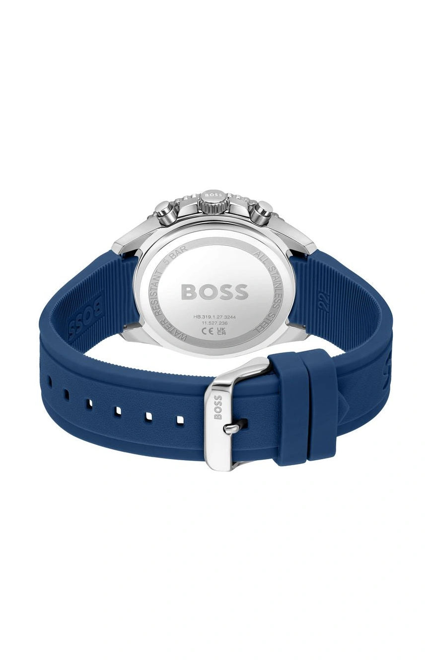 Its vibrant blue silicone strap provides comfort and durability, while 5 ATM (50m) water resistance ensures reliability for daily wear and light water exposure. Combining athletic style with functional precision, the Hugo Boss Runner Chronograph is ideal for men seeking a stylish, versatile, and performance-driven watch.