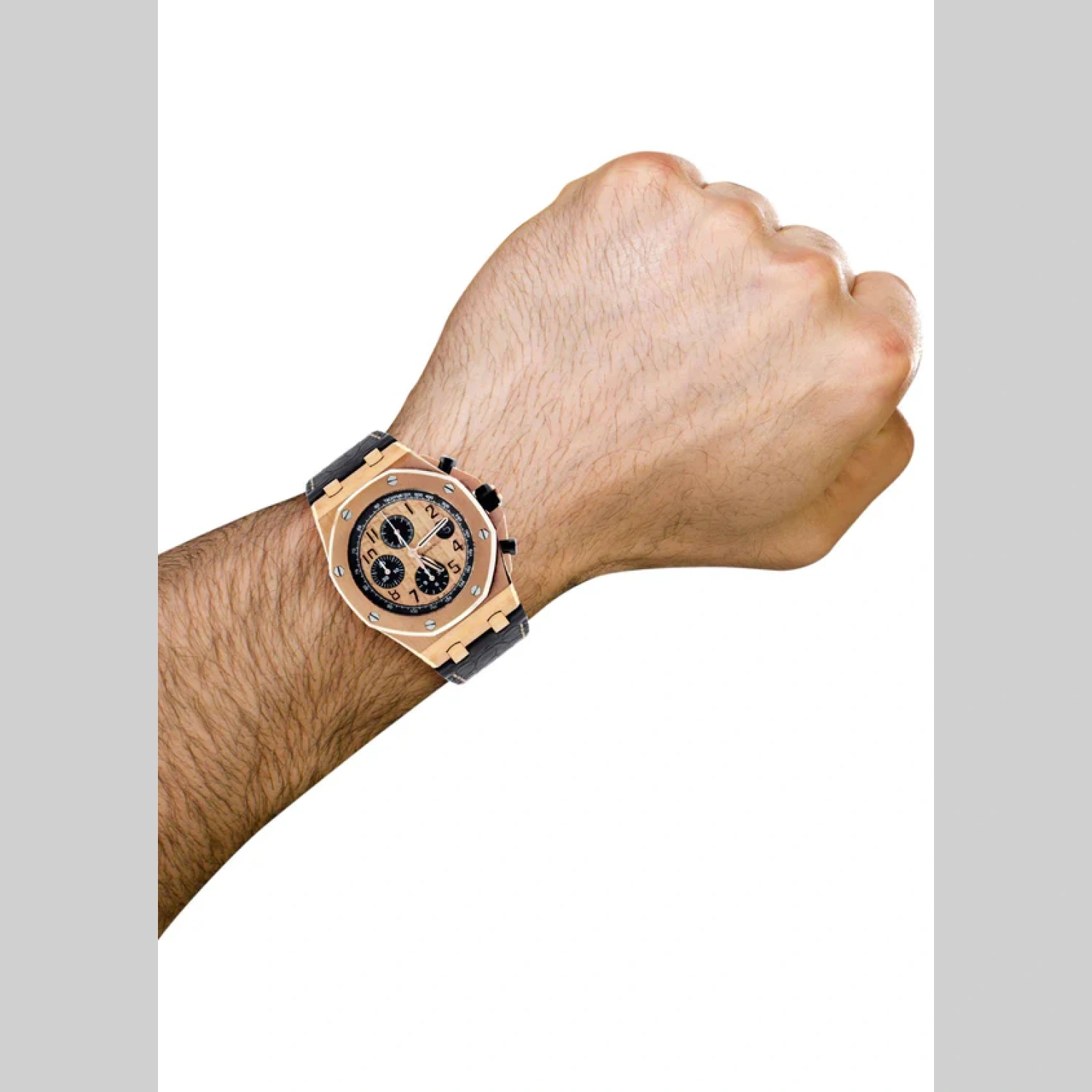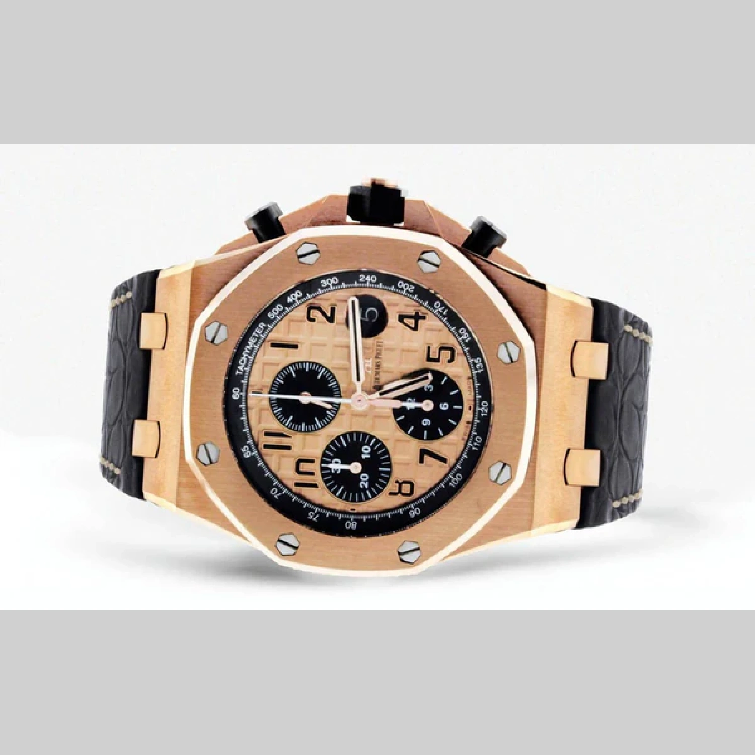 - This Selfwinding Chronograph combines a pink gold case, black “Méga Tapisserie” dial, black ceramic pushpieces and crown, and a black alligator strap. The half-brick lets you enjoy one of AP’s most wanted watches with still casual wear with the black leather strap. This timepiece does don’t include box or papers. However, it has a 100% authenticity guarantee.