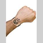 This Selfwinding Chronograph combines a pink gold case, black “Méga Tapisserie” dial, black ceramic pushpieces and crown, and a black alligator strap. The half-brick lets you enjoy one of AP’s most wanted watches with still casual wear with the black leather strap. This timepiece does don't include box or papers. However, it has a 100% authenticity guarantee. Product Details Brand Audemars Piguet Box Original Factory Box Papers Original Factory Papers Case Material steel Band Material Rubber Case Water Resistance 10ATM Movement Automatic Case Size 42mm Case Color Rose Gold Complications Chronograph Gender Men Warranty 2 Years