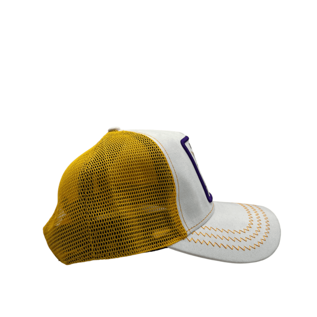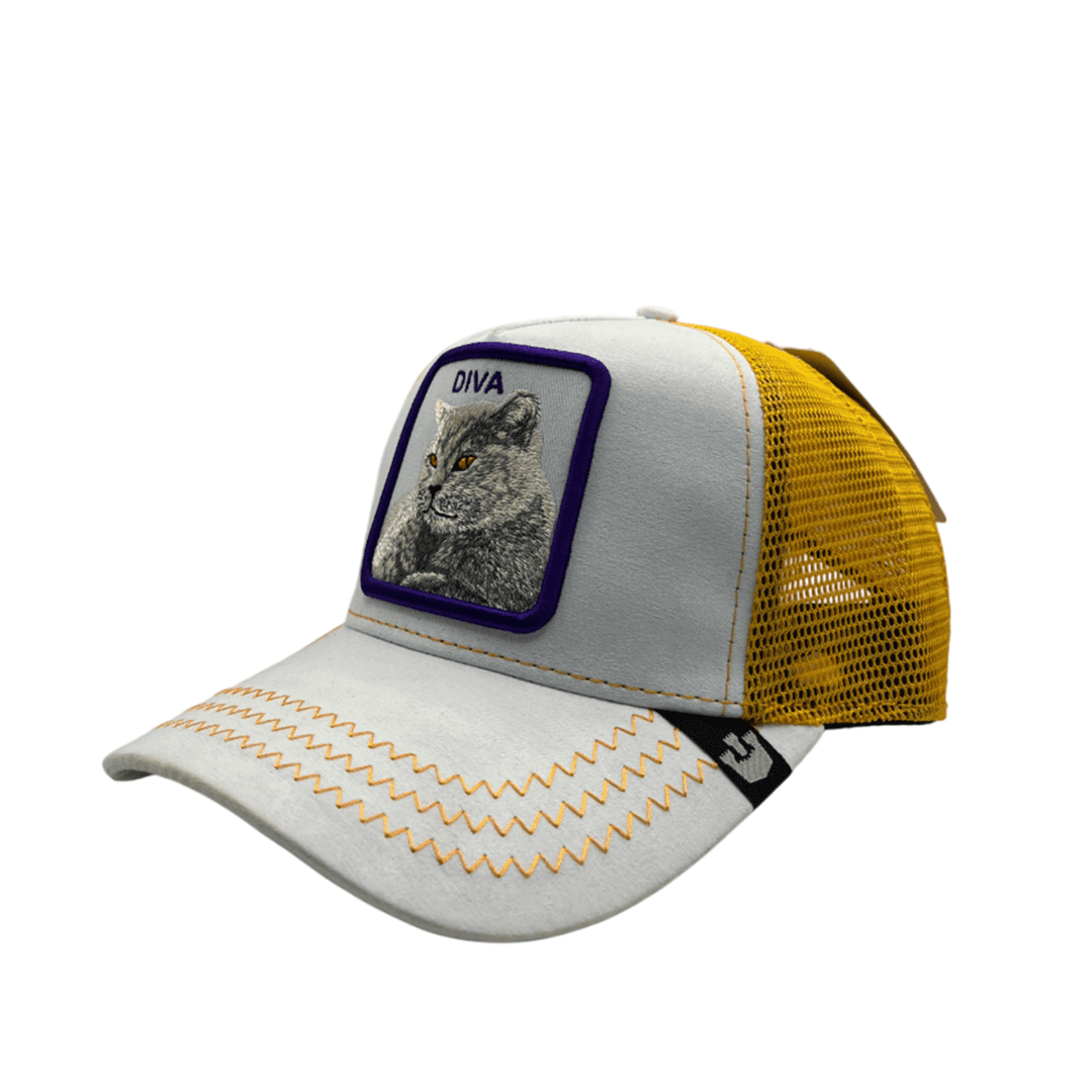 Goorin Bros. Trucker Cap in a stylish gray and navy color combination. Designed with a breathable mesh back for comfort, this cap features an embroidered patch of a confident cat with the word "DIVA" , making it a bold statement piece for any outfit. Product Details Material Polyester fabric brand GOORIN BROS The back part Mesh Size adjustment Adjustable Durability Durable Gender Men Warranty 6 Months